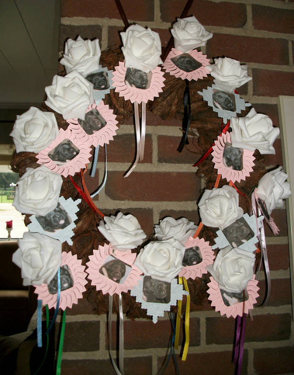 zelfgemaakt kraamkado: een prachtige puppykrans, met foto'tjes van alle Newfybaby's